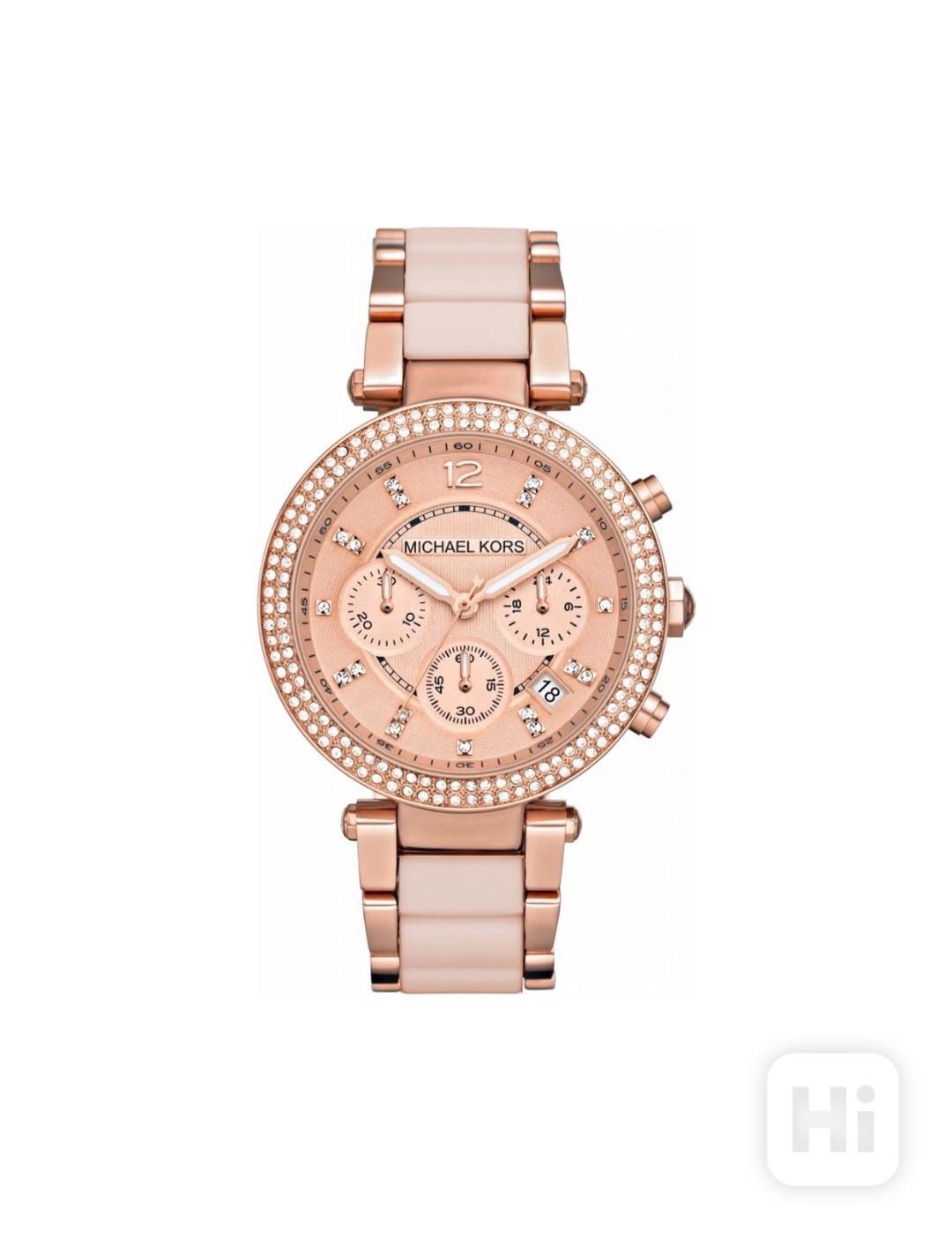 Krásné hodinky Michael Kors Parker, MK5896. Jedná se o elegantní chronograf s výrazným designem v barvě růžového zlata v kombinaci se světle růžovými (pudrovými) články v tahu.