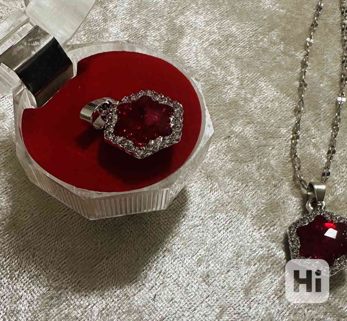 Řetízek z nerezové oceli s přívěskem s červeným kamenem.