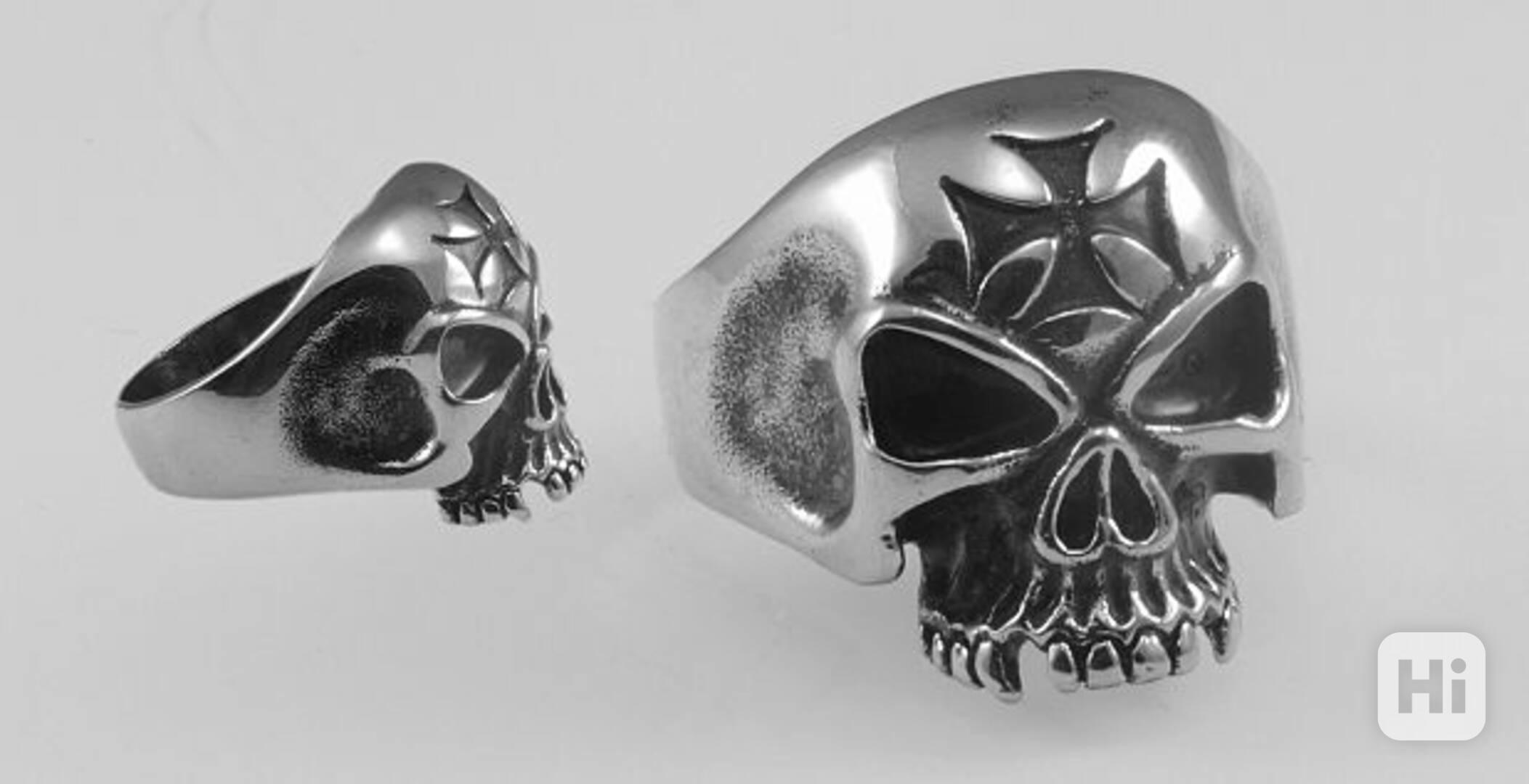 z chirurgické oceli. Leštěný povrch, patina. Lebka s plastický maltézským křížem. Nebo-li také válečným křížem.